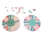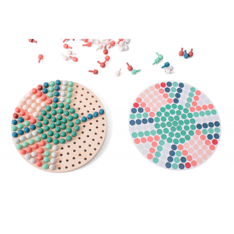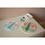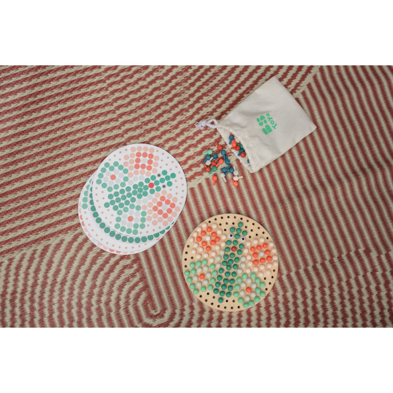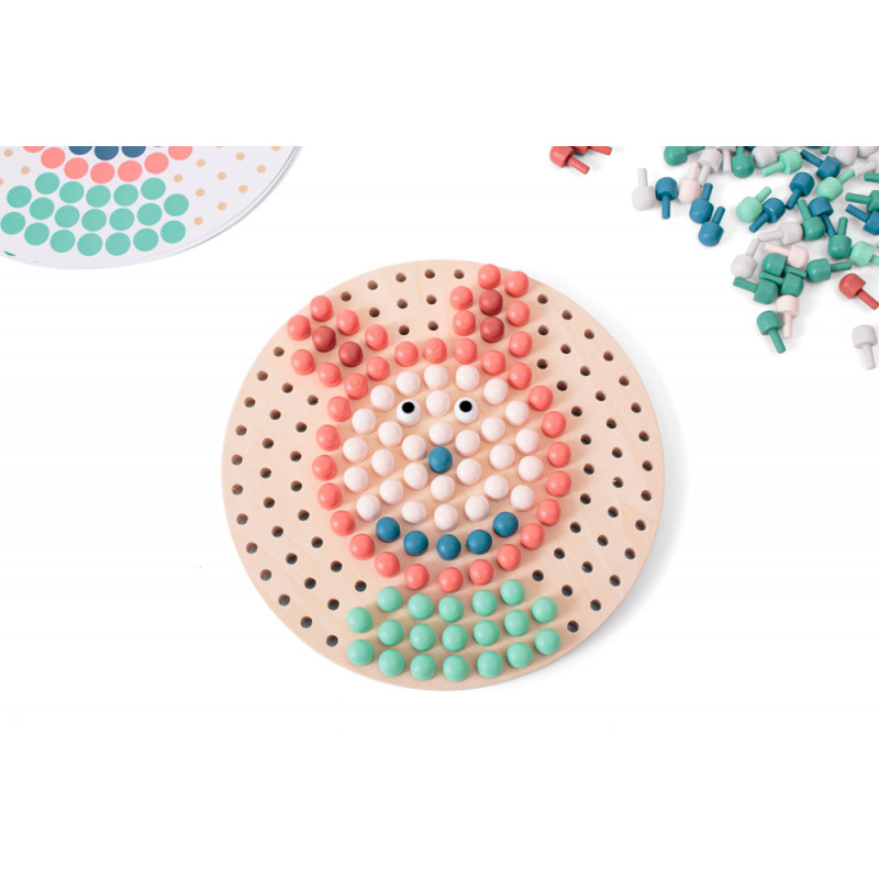 Setul cuprinde: 1 placa cu diametrul de 19 cm; 217 piuneze 1×2 cm; 6 carduri cu 12 modele, diametru 19 cm; saculet din bumbac