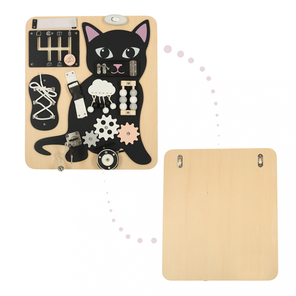 * Placa senzoriala Black Kitty este o optiune deosebit de atractiva pentru copii, datorita designului sau jucaus si a multitudinii de activitati pe care le ofera.