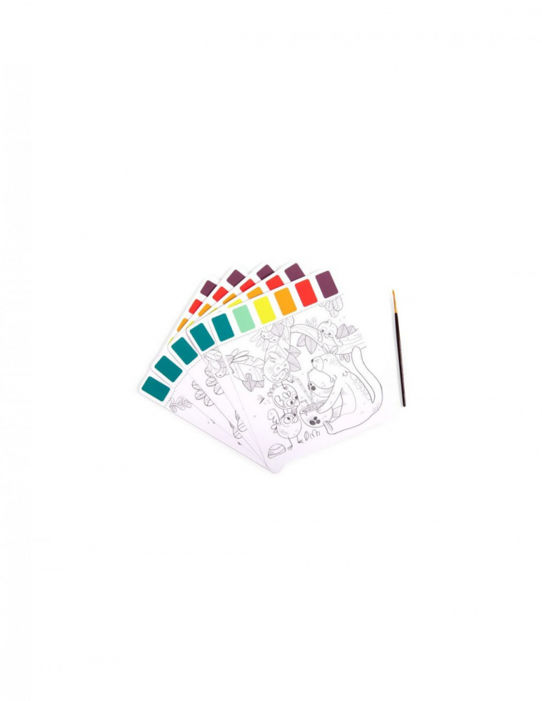 Mapă cu 10 ilustrații ale personajelor din junglă, de pictat folosind pensula încorporată și paleta de culori.