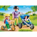 Setul de joc contine trei figurine PLAYMOBIL, un carucior sport, o trotineta, o casca si alte elemente suplimentare.