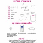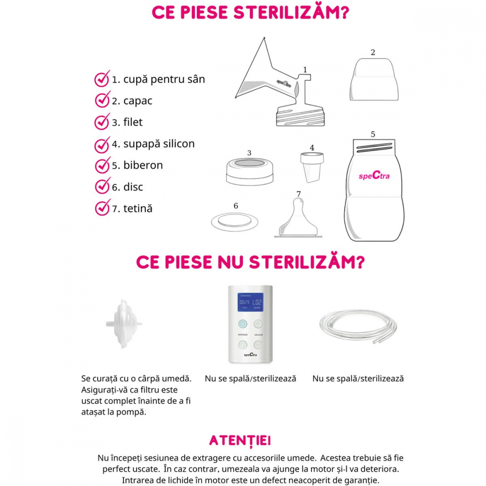 Atentie! Acest produs este un dispozitiv medical si are un caracter igienico-sanitar. El nu se returneaza, daca a fost desigilat conform O.U.G. 34/2014 Art. 16 lit. e). Componentele care intra in contact cu laptele trebuiesc sterilizate inainte de fiecare utilizare. Laptele matern poate fi stocat 72 de ore in frigider si pana la 3 luni in congelator. Laptele matern nu se incalzeste la microunde si nu se fierbe. Folosirea componentelor la mai multe persoane poate duce la transmiterea diverselor boli.