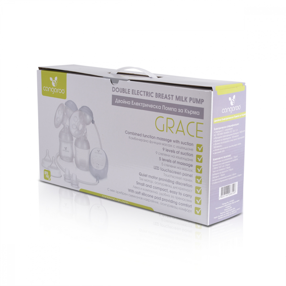 Pompa de san electrica dubla Cangaroo Grace, cu putere reglabila de aspiratie este ideala pentru orice mamica ce doreste sa extraga laptele pentru hranirea ulterioara a bebelusului. Utilizati pompa de san dubla in momentele linistite si de relaxare pentru ca laptele sa curga mai usor.