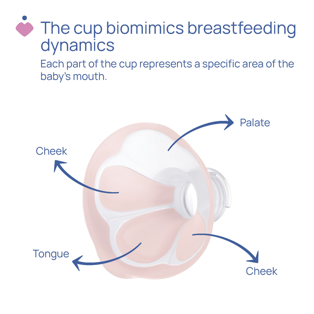 • Cupa din silicon 100%: Fabricata cu tehnologie bi-injectata, cupa este moale si delicata cu sanul, imitand miscarile limbii si obrajilor bebelusului, oferind un masaj fiziologic precis si stimulare eficienta pe san.