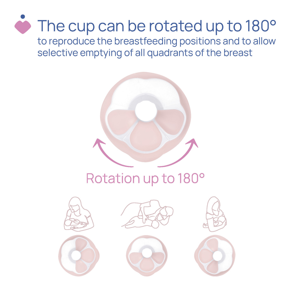 • Rotire de pana la 180°: Cupa se poate roti manual pana la 180°, permitand replicarea diferitelor pozitii de alaptare si golirea completa a fiecarei zone a sanului, protejand in acelasi timp zonele dureroase.