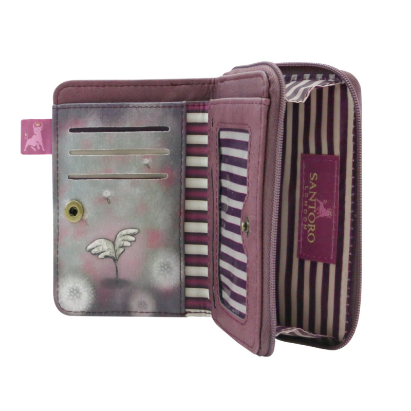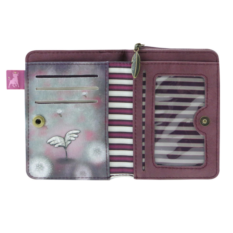 - Exteriorul portofelului este reprezentat de magica Little Wings inconjurata de florile specifice acesteia. Spatele portofelului este in nuante de gri si roz.