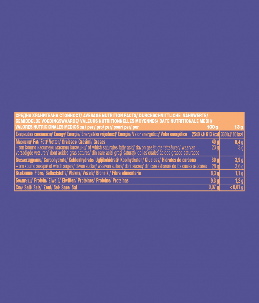 Ingrediente: zahar de cocos, ALUNE de padure prajite* (27%), masa de cacao*, unt de cacao*, crema de cocos*, ulei de cocos*, faina de cocos*, emulgator: lecitina din floarea soarelui*.