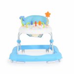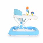 Premergator pliabil pentru copii Moni Eko Blue cu inaltime sezut reglabil,spatar inalt si confortabil,panou cu jucarii,roti pivotante si protectii cauciucate siguranta praguri