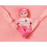 Papusa are chiar si propriul biberon turcoaz. Dar joaca si mancatul sunt foarte obositoare: cand intindeti papusa pe spate, ea isi inchide ochii albastri.