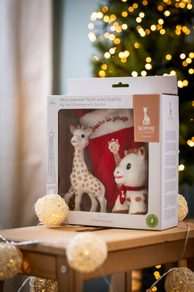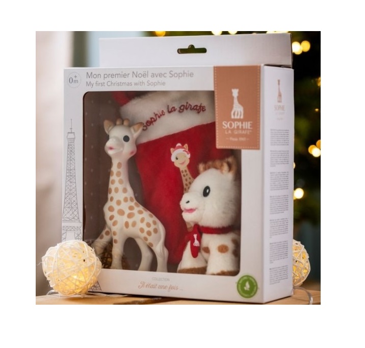 Acest set cadou "Primul meu Craciun alaturi de girafa Sophie" include celebra jucarie din cauciuc natural girafa Sophie (este prima jucarie a bebelusului care ii dezvolta toate simturile: vazul, auzul, gustul, atingerea si mirosul), un plus baby Sophie (14cm) (cu o marime ideala pentru ca mainile mici ale bebelusului sa o mangaie si sa o apuce) si o soseta pt cadouri cu imaginea lui Sophie!