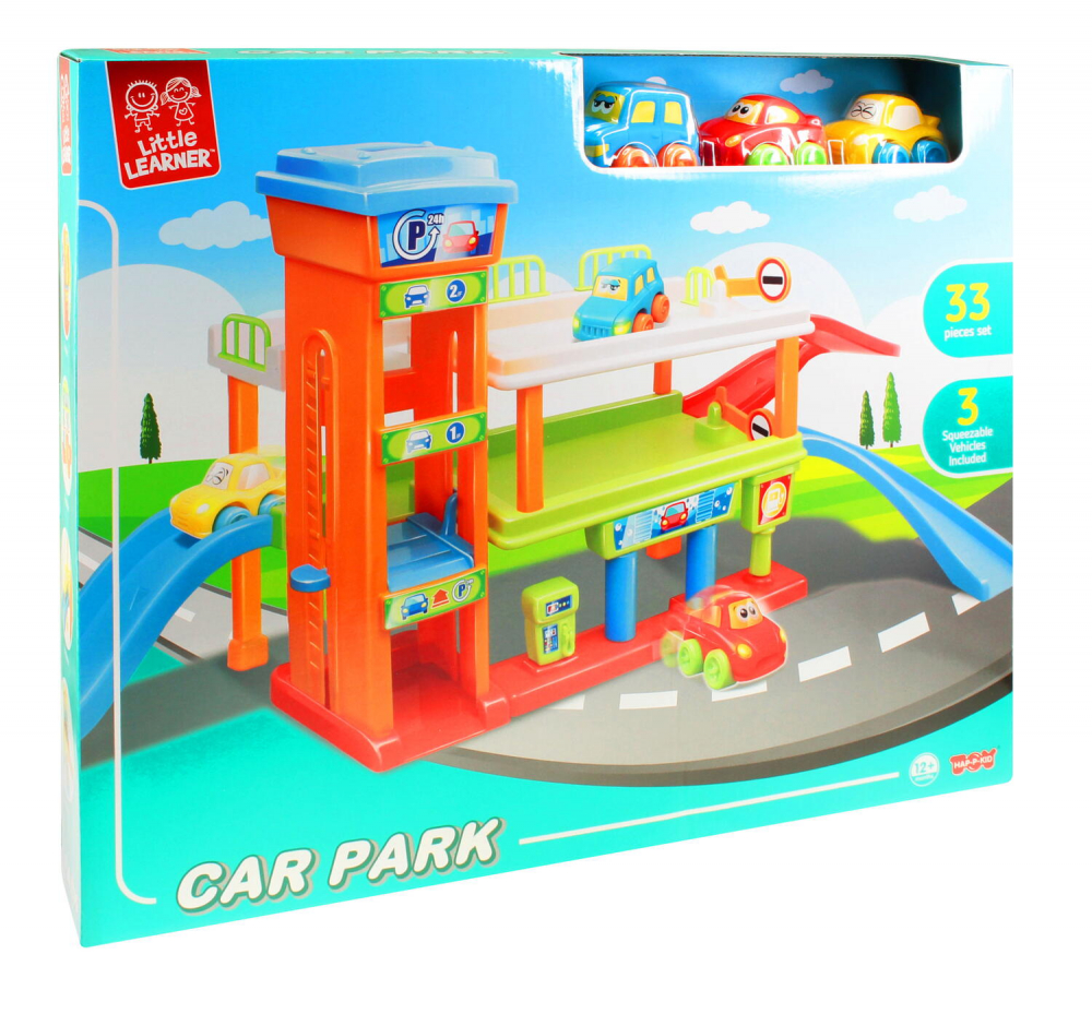 • Setul include 33 piese: 3 masinute, rampe, parcari supraetajate, benzinarie, spalatorie auto etc.