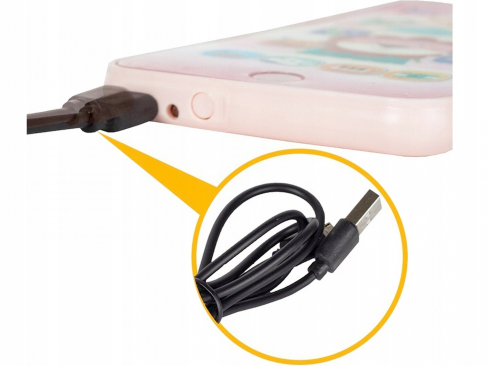 * Telefonul are 13 butoane tactile si o tasta - fiecare este responsabil pentru o functie diferita. Fiecare interactiune a copilului provoaca o reactie a dispozitivului, acesta raspunde cu sunete, melodii, lumini
