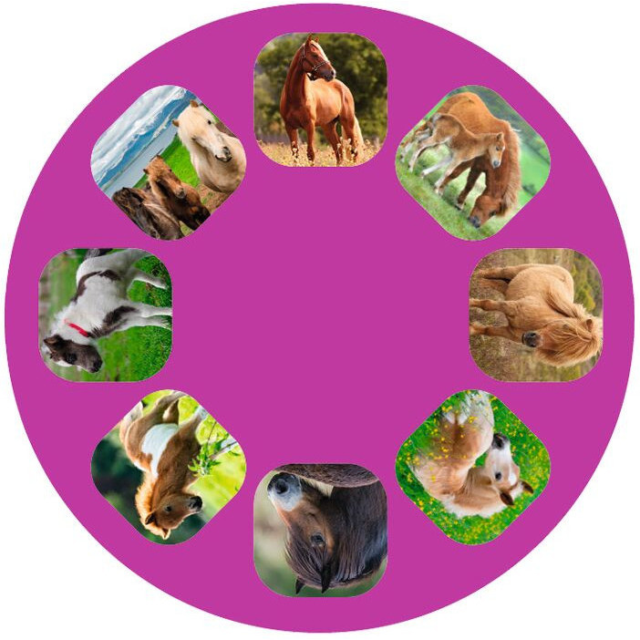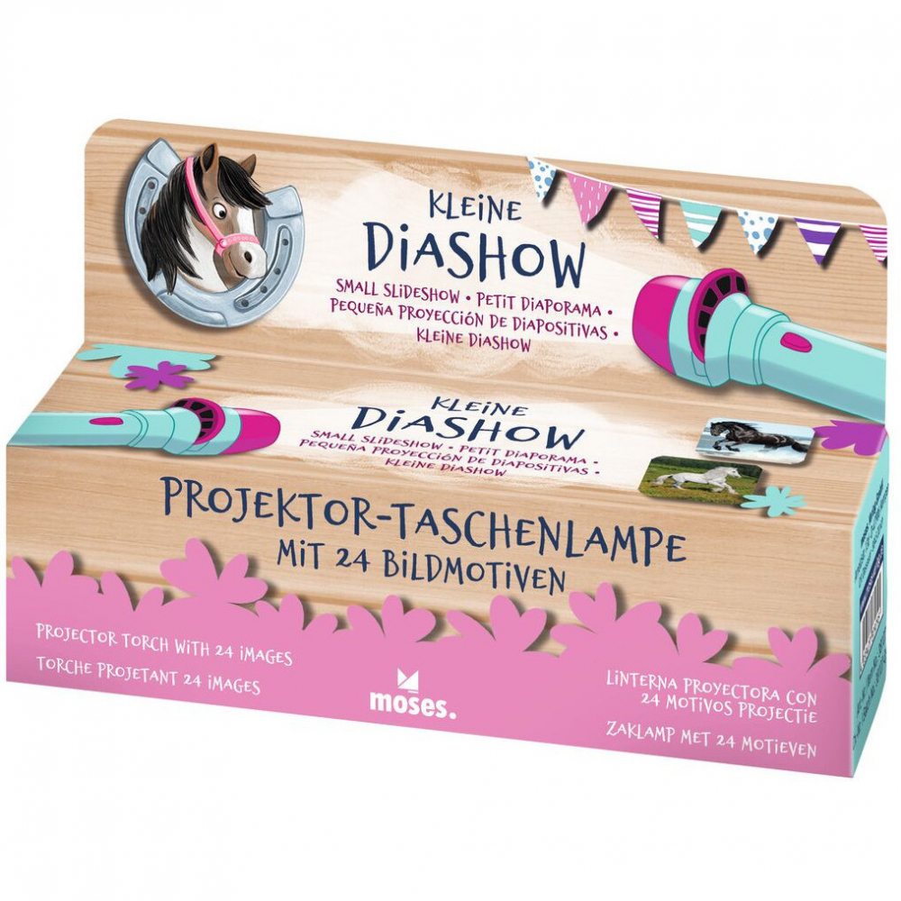Are 24 de fotografii de cai si ponei din 22 rase diferite. Proiecteaza imagini cu latimea de pana la 1 m. Rotiti capatul lentilelor pentru a focaliza imaginea.