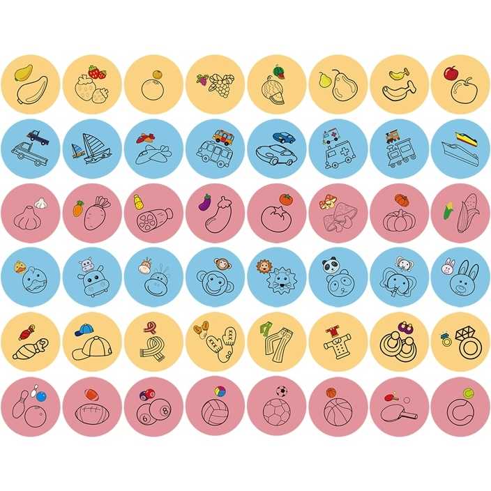 Setul are incluse 6 discuri cu 48 de poze pe diverse teme: fructe, legume, haine, sporturi, animale, vehicule.