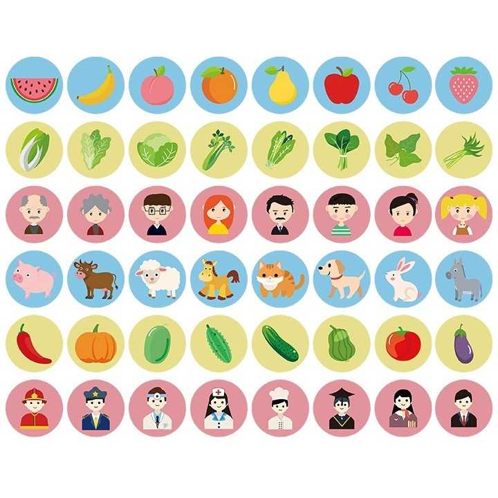 Sunt incluse 6 diapozitive cu Fructe, Legume, Meserii, Animale, Membrii familiei.