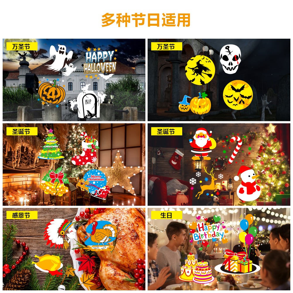 Poti acum sa schimbi tematica decorului in doar cateva secunde! Este necesar doar sa scoti din proiector suportul destinat figurinelor si sa il inlocuiesti cu un altul, cele 15 incluse in pachet avand variate modele, de la Fulgi de nea, Halloween, Inimioare, Happy Birtday, pana la Cer instelat si Brazi de Craciun, etc.