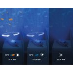Cu posibilitatea de a alege intre cele 3 variante de sunete (valurile oceanului, bataile inimii sau cantec de leagan), poti transforma camera micutului tau intr-o lume subagvatica magica, cu valuri miscatoare si pestisori inotatori acompaniati de sunetul specific ocenului.