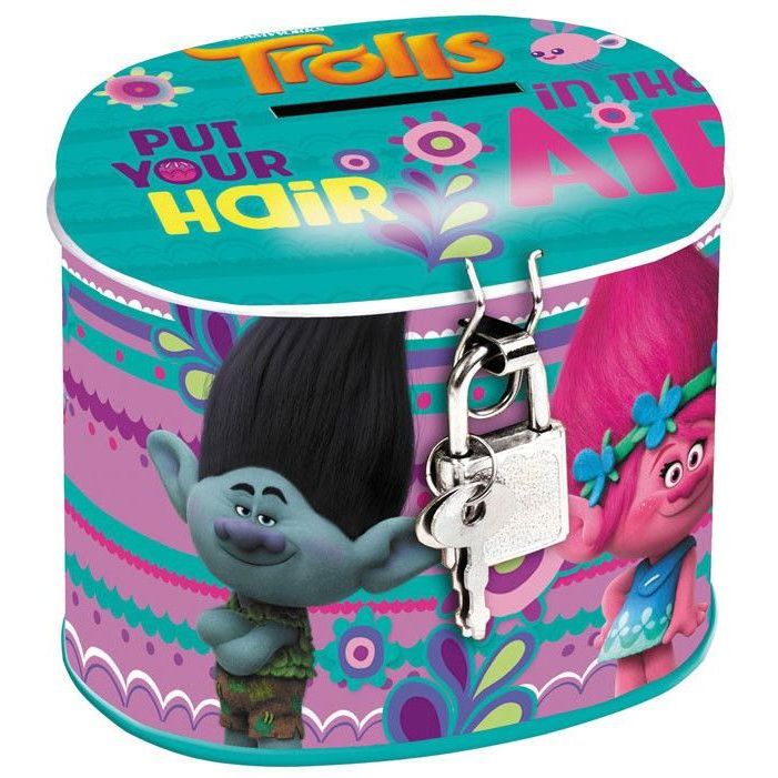 Pusculita are o forma ovala, imprimata cu personajele din Trolls