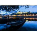 O barca de lemn pare abandonata pe malul lin al unui rau, cu ape ce oglindesc lumina calda a orasului situat pe deal.