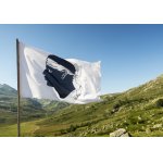 In prim-plan, un steag alb este agitat de vant, aratand un profil uman negru - o fata de barbat ce poarta o bandana, reprezentand simbolul traditional al Corsicii, cunoscut sub numele de 'Capul moru'.