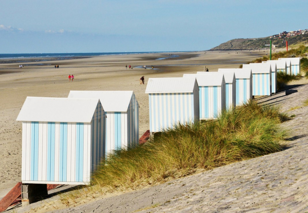 Fotografia surprinde o plaja linistita cu nisip larg, extinsa sub un cer senin. In prim-plan, se observa un sir de casute de plaja dungi albe si albastre, amplasate pe un mic val de dune acoperite cu iarba.