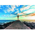 Imaginea puzzle-ului Bluebird - La Reunion - Jetee et Phare de Saint Pierre surprinde un peisaj maritim spectaculos, cu un far mic aflat la capatul unui dig de piatra, intr-o zi cu cerul colorat in nuante de albastru, roz si portocaliu, amintind de un apus sau rasarit de soare.
