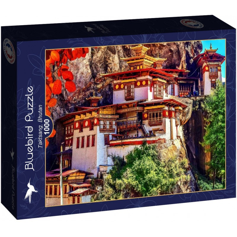 Imaginea puzzle-ului cu 1000 piese Bluebird - Taktsang, Bhutan surprinde un templu budist spectaculos amplasat pe muchia stancilor inalte, cunoscut sub numele de Taktsang Palphug sau 'Cuibul Tigrului', in Bhutan.