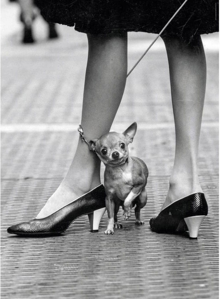 Fotografia alb-negru surprinde o scena urbana ce se concentreaza pe detaliul picioarelor unei femei incaltate in pantofi eleganti cu toc inalt, si un mic caine Chihuahua ce sta intre acestea.