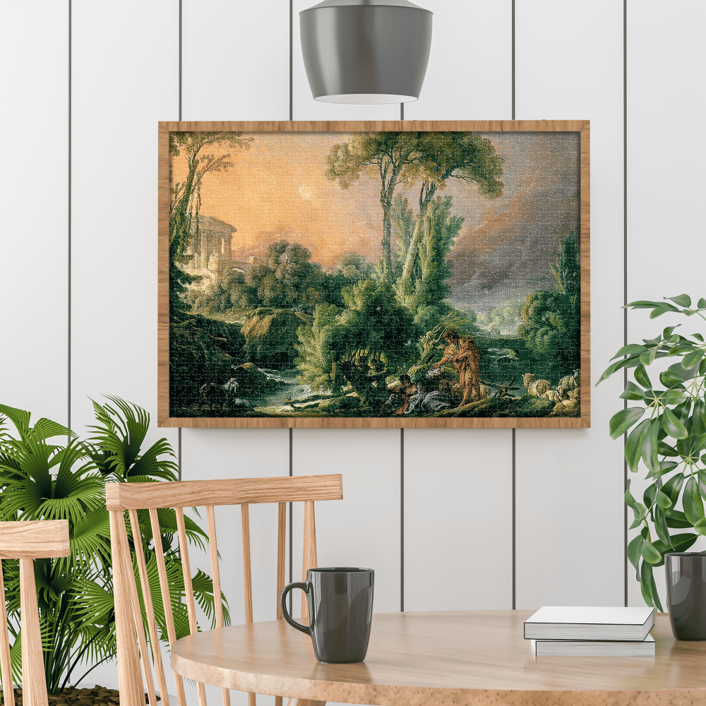 Cumpără acum puzzle-ul de 1000 de piese François Boucher – River Landscape with an Antique Temple și creează-ți un obiect decorativ deosebit!