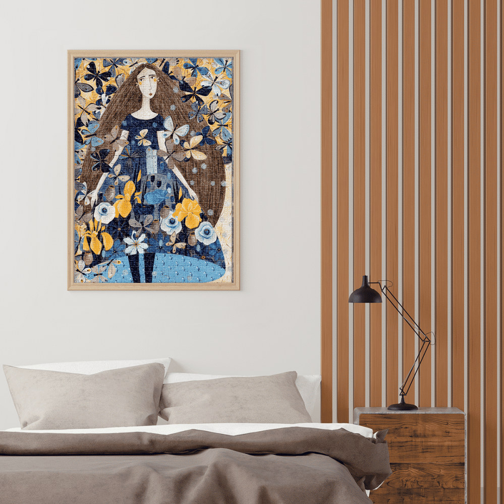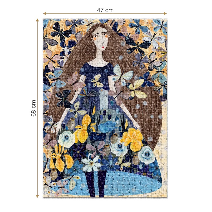Ilustrația din puzzle 1000 piese Primăvara înfățișează zâna primăverii într-o explozie de culoare, flori și fluturi, într-un cuvânt: viață.
