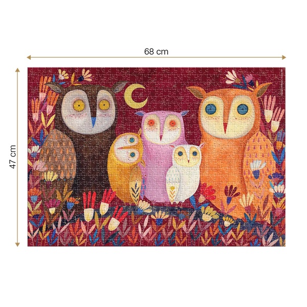 Puzzle 1000 piese Kurti Andrea – Owls iti prezinta o familie de bufnite simpatice, ilustrate in culori calde.