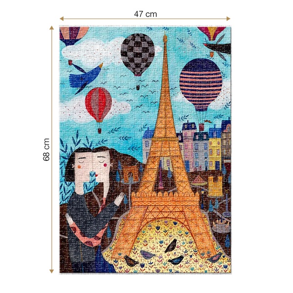 Acest puzzle adulti este o ilustratie deosebita avand in prim plan impozantul Turn Eiffel in jurul caruia plutesc baloane de aer colorate si doi indragostiti care isi traiesc sarutul langa unul dintre cele mai vizitate obiective din lume.