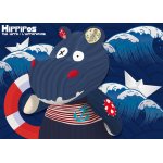 Aceasta ilustratie colorata prezinta un hipopotam stilizat pe fundalul unui ocean tumultos cu valuri mari, in stilul valurilor traditionale japoneze.