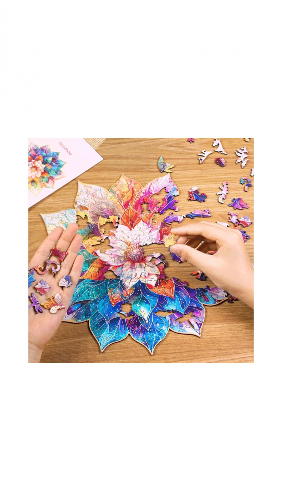Floarea Mistica Mandala este un puzzle 2D din lemn format din piese de forme speciale.