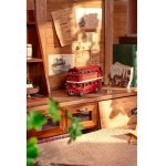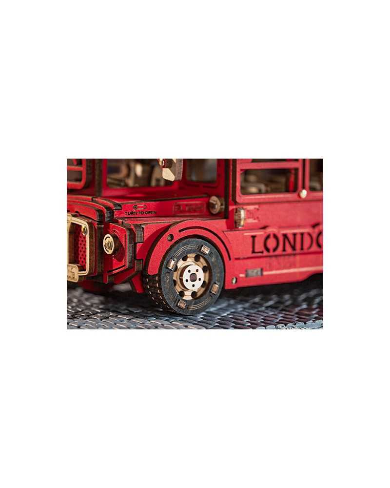 Și, în plus, aveți detalii precum perdele, o treaptă separată și inscripții „Întoarceți pentru a deschide” și un autocolant „Faceți o călătorie pe un reper din Londra” și „Faceți o călătorie la un reper din Londra”. Pe partea laterală a autobuzului puteți vedea Tower Bridge și roata Ferris. Este un lucru bun, pentru că în gama noastră avem și puzzle-uri din lemn pentru adulți din Tower Bridge și Big Ben cu lumini și, de asemenea, o roată Ferris cu muzică!