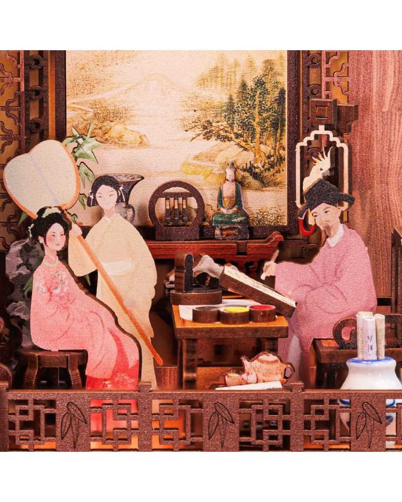 Rafturile clasice sunt pline cu cărți și antichități; pe masă sunt așezate lucrări de caligrafie neterminate; iar câteva flori de piersic se presără pe masă, făcând oamenii să se simtă în largul lor și confortabil;
