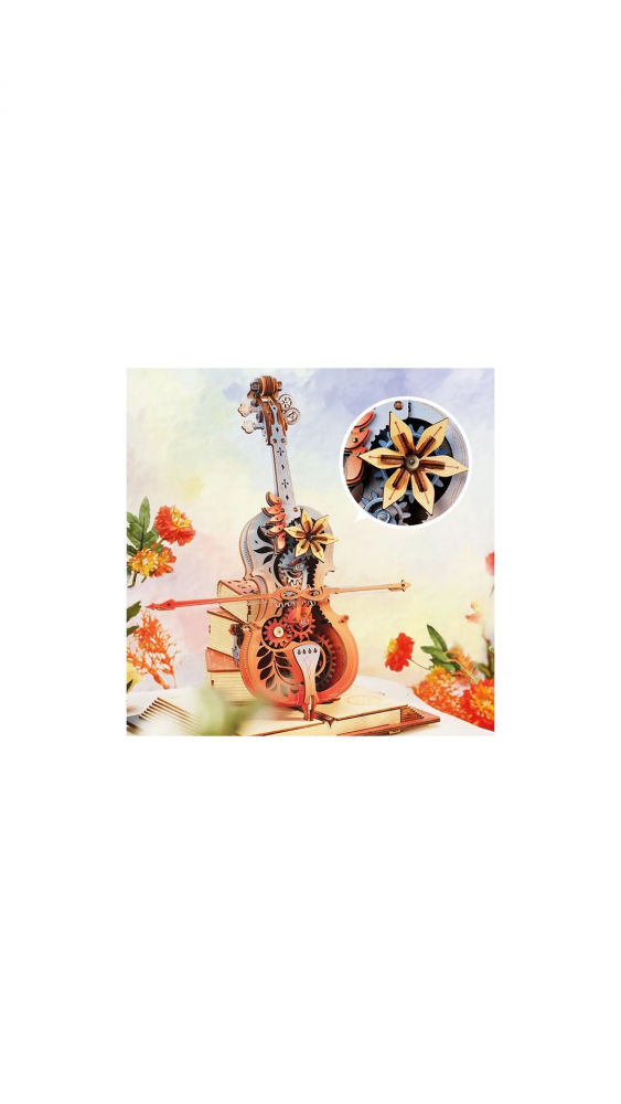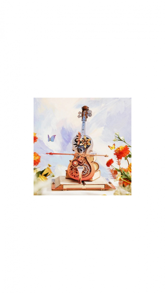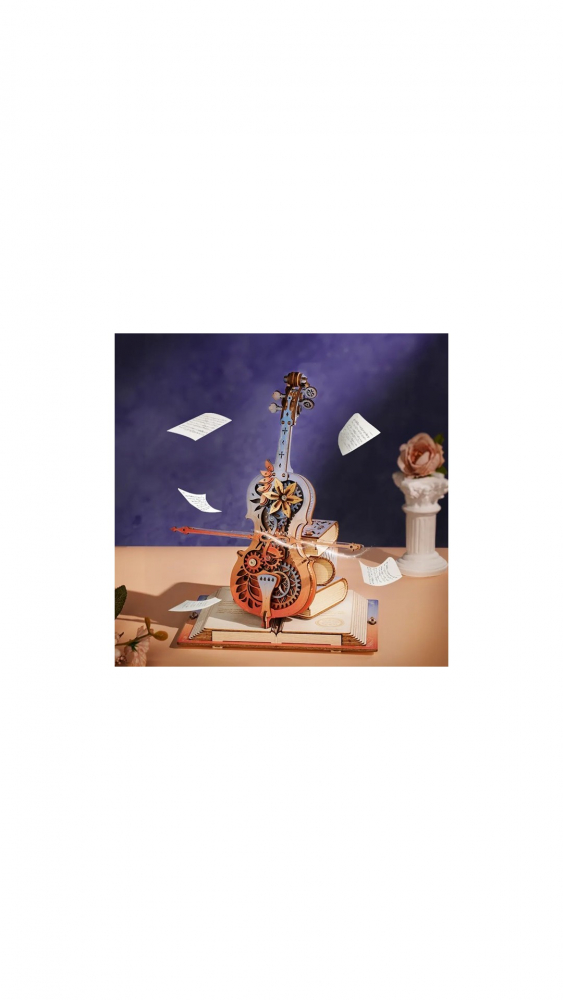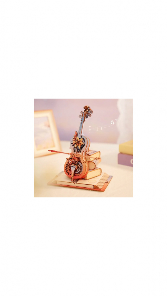 Fiecare detaliu minutios adauga farmec si romantism acestei cutii muzicale: de la inscriptiile inspirationale, la curbele violoncelului si cotoarele cartilor, pana la micutul prieten blanos ascuns in spate.