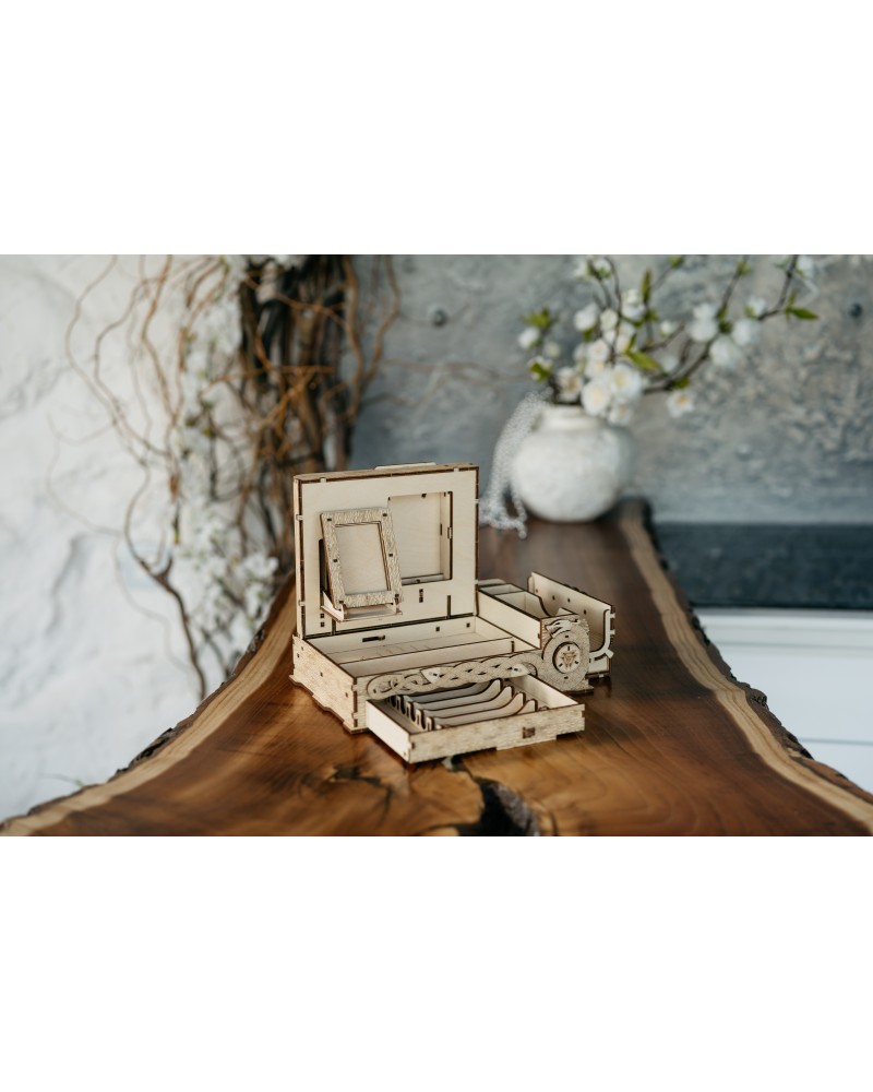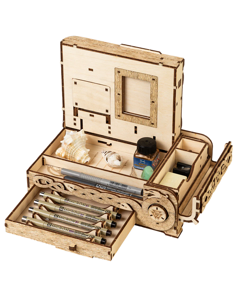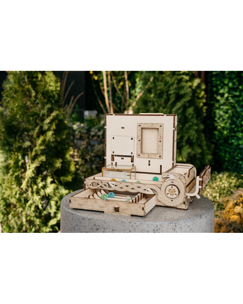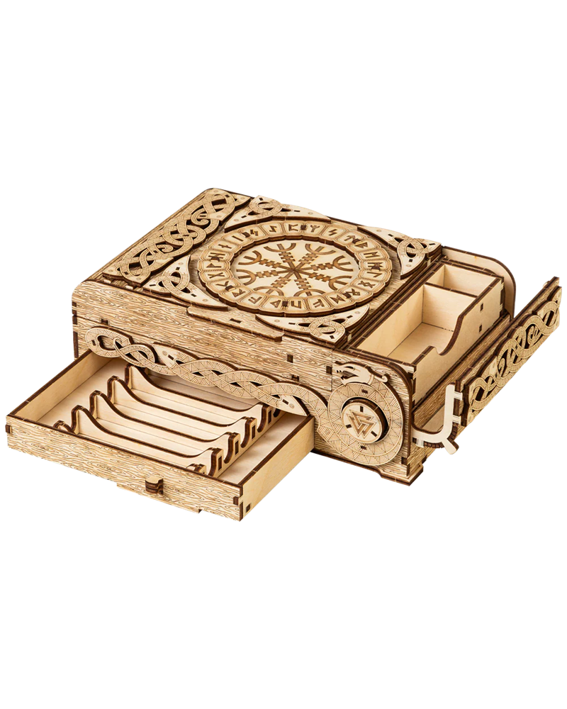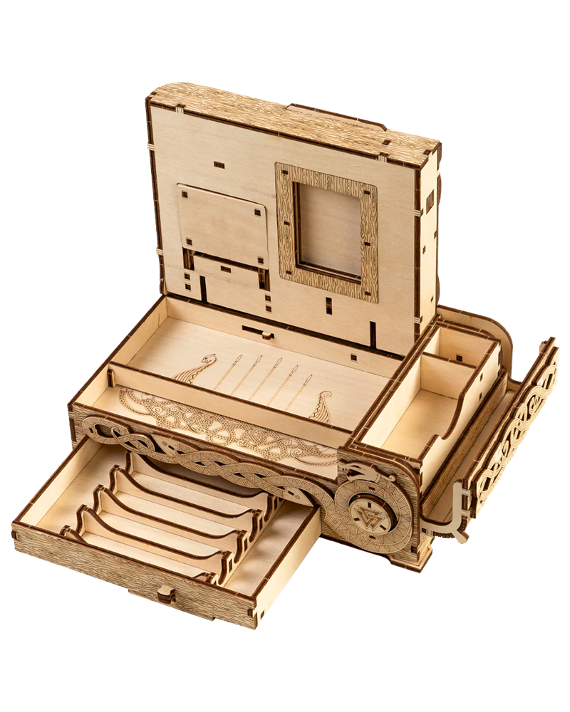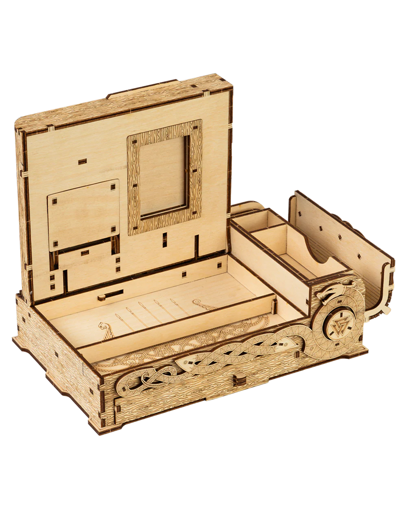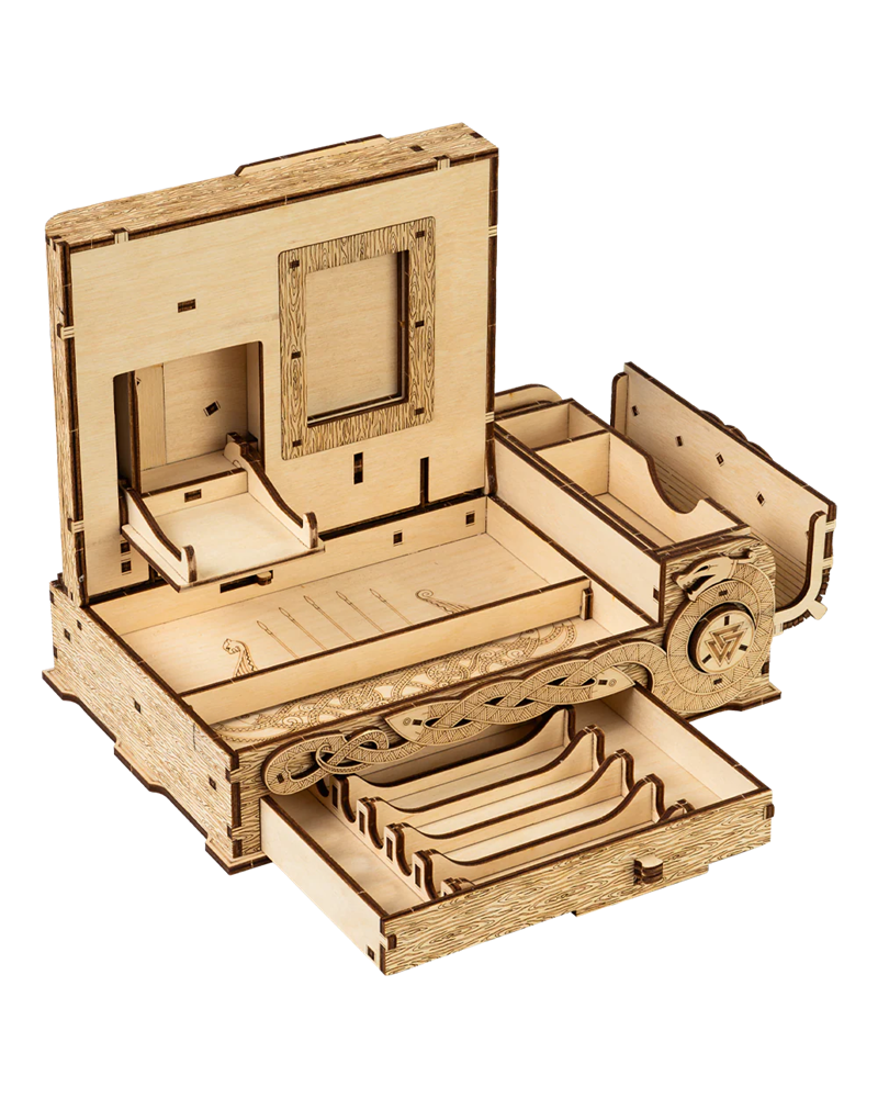 Realizata cu 202 piese din lemn natural finisat, Nordic Chest te invita sa descoperi un sistem mecanic ingenios, cu multiple compartimente si mecanisme ascunse.