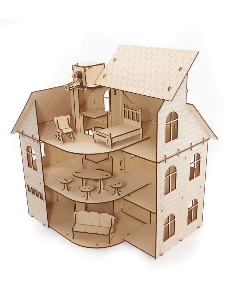 Explorează și creează o lume uimitoare cu această casă de păpuși superbă: 3 etaje, cu lift mecanic, set complet de mobilier (pat, balansoar, bancă, 3 scaune și o masă mare), uși care se deschid și o terasă.