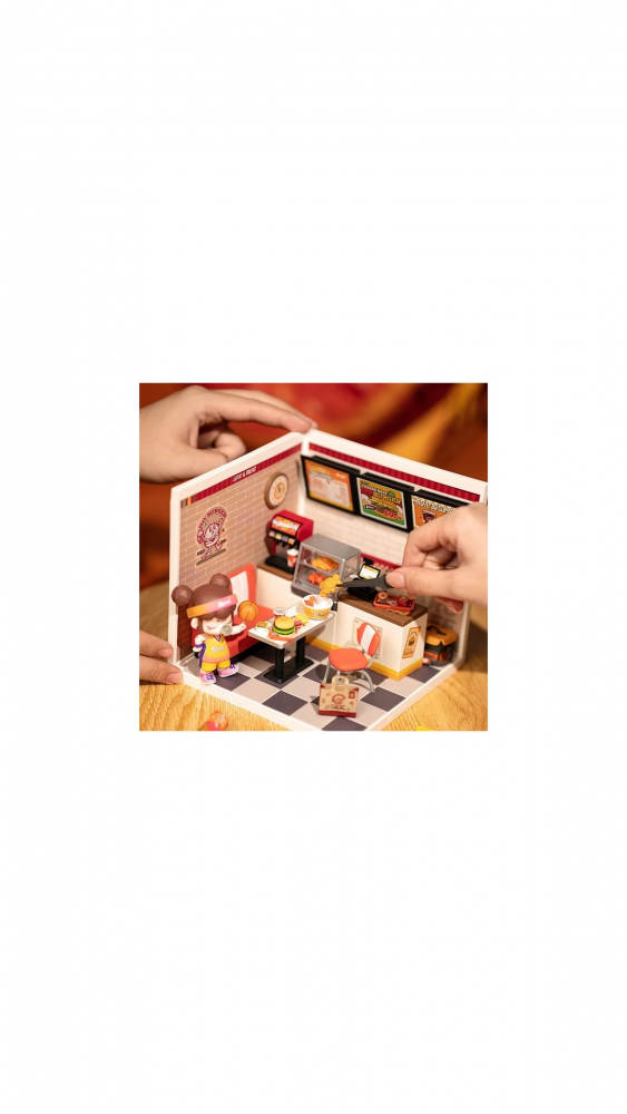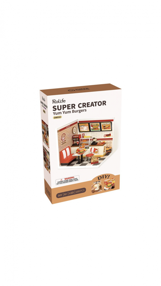 Noua adăugire la seria Rolife DIY Plastic Miniature House Super Creator este aici! Yum Yum Burgers, cu atmosfera sa nostalgică de diner clasic, este locul perfect pentru a petrece timp cu prietenii și a te bucura de mâncare bună.
