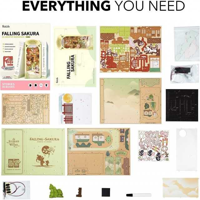 Setul contine tot ce este necesar pentru a construi acest taram minuatural al minunilor cu flori de cires cum ar fi cladirile, valea de munte, luna, copacii, raul, etc.