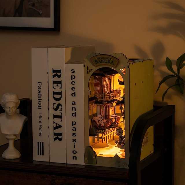 Cotorul de carte Orasul florilor de cires este o casuta miniaturala din lemn.