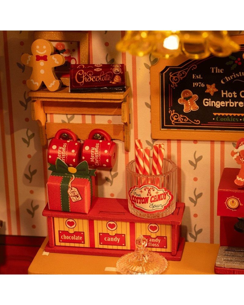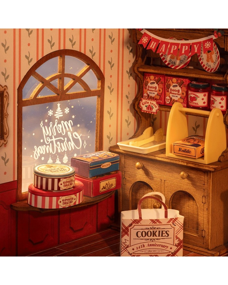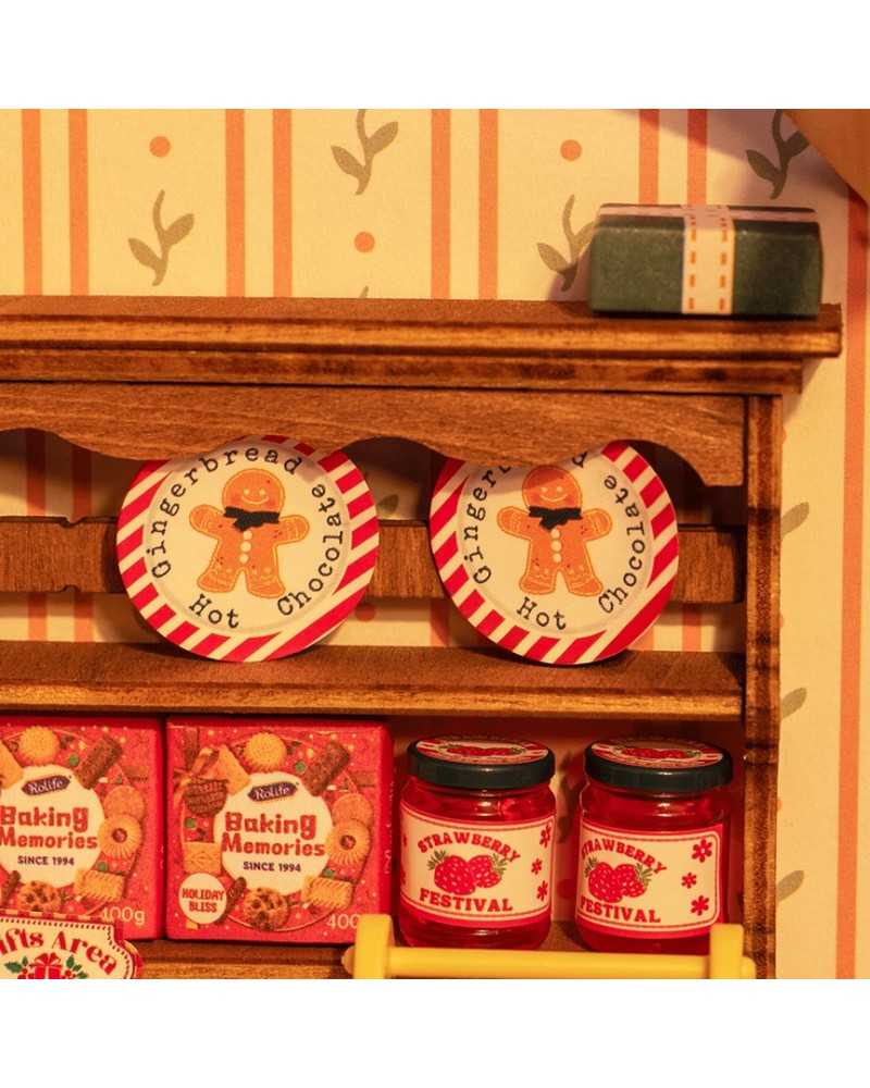 Primele fulgi cad, iar orașul se liniștește. Înăuntrul căsuței, lumina caldă se aprinde, iar prin fereastră vezi rafturi pline cu biscuiți glazurați, gemuri și prăjituri de sărbătoare.