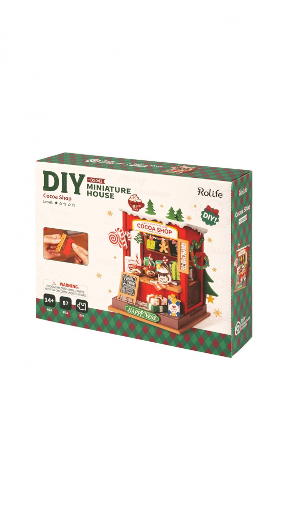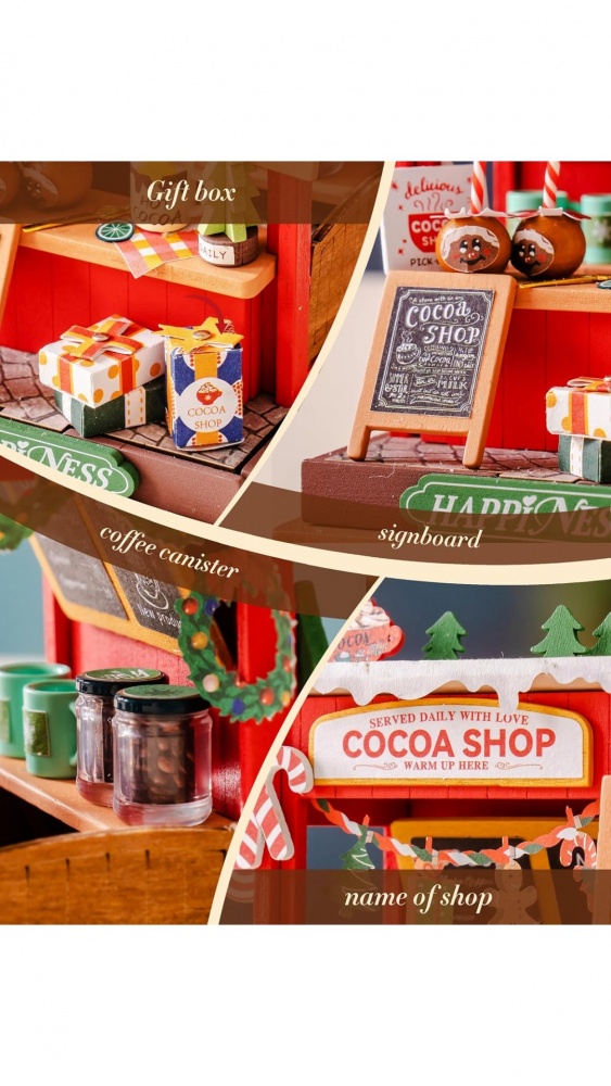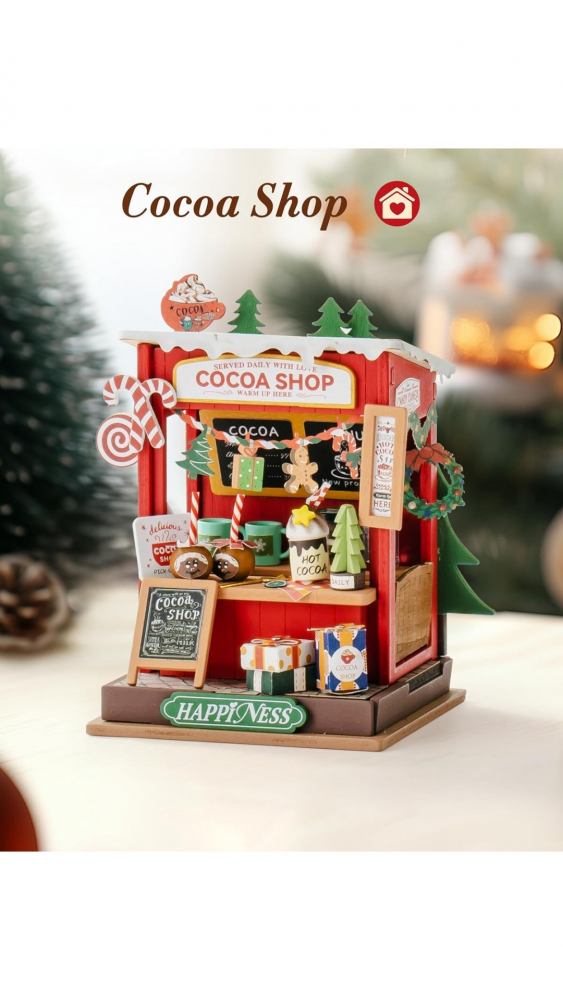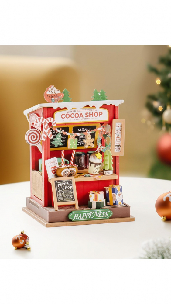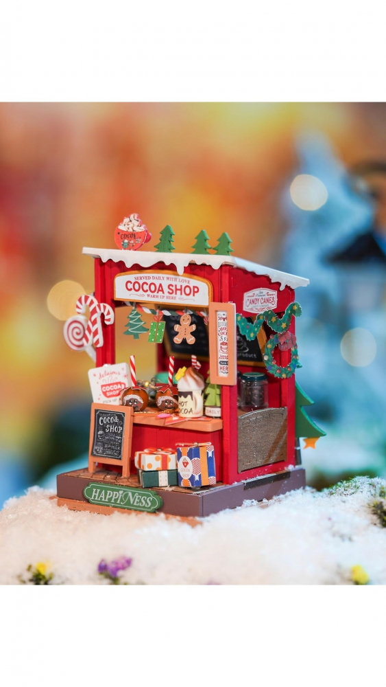 Acest model înfățișează o un magazine de cacao în miniatură care simbolizează căldura și bucuria unei zile reci de iarnă.
