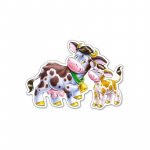 Prima grupare cuprinde o vaca maro si alba, impreuna cu un vitel, ambele zambind si purtand clopotei verzi la gat.