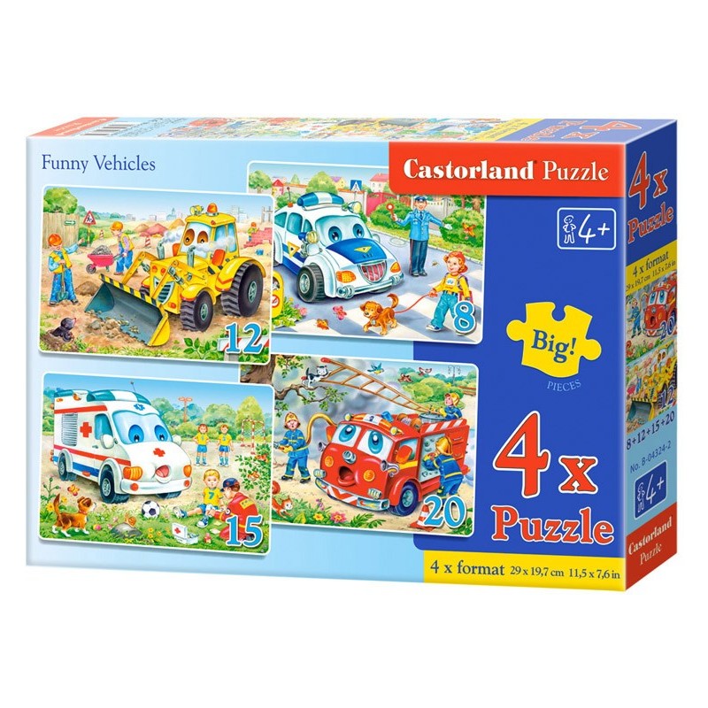 Cu puzzle-ul Castorland - 4 in 1 Funny Vehicles, fiecare copil poate explora lumea fascinanta a masinilor si a interactiunilor lor amuzante.