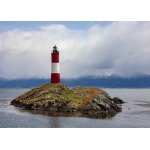 Farul, cu dungi rosii si albe, se inalta pe o mica insulita stancoasa, intr-un peisaj dominat de munti inalti, partial acoperiti de nori si zapada.