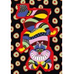 Stilul modern si stilizat al ilustratiei, cu forme geometrice si culori stralucitoare, pune in valoare figura zambitoare a pisicii, cu un zambet larg si ochi expresivi, pe un fundal negru punctat cu cercuri rosii si galbene, creand un contrast puternic.