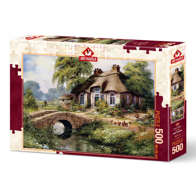 - Puzzle-ul 500 piese Green Village-Reint Withaar, este taiat cu lame monobloc de 1000 de piese. Fiecare piesa are o taietura diferita. Nici o piesa nu se potriveste nicaieri altundeva. Productia se face neatinsa de mana umana, prin imprimarea pe carton albastru gros de 2 mm.