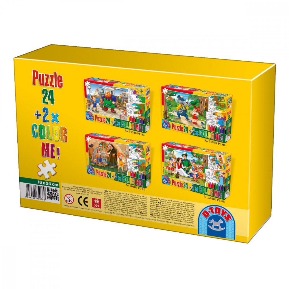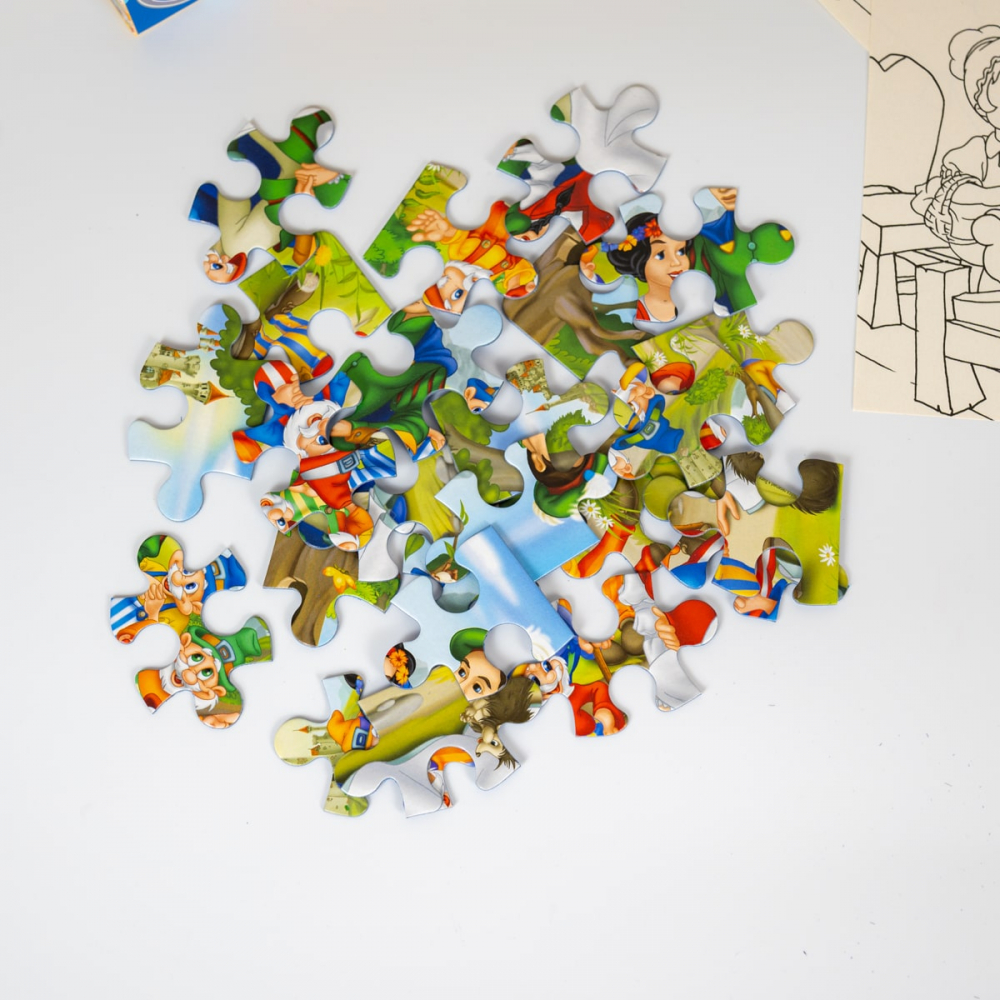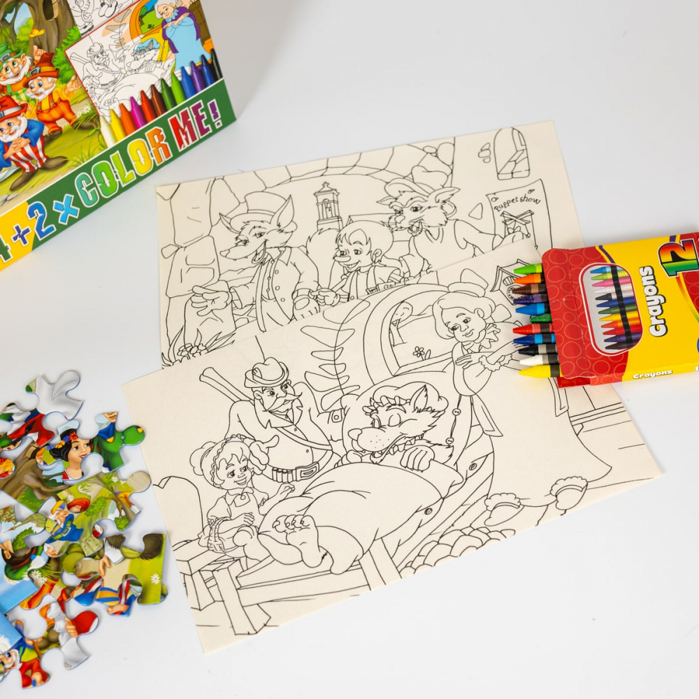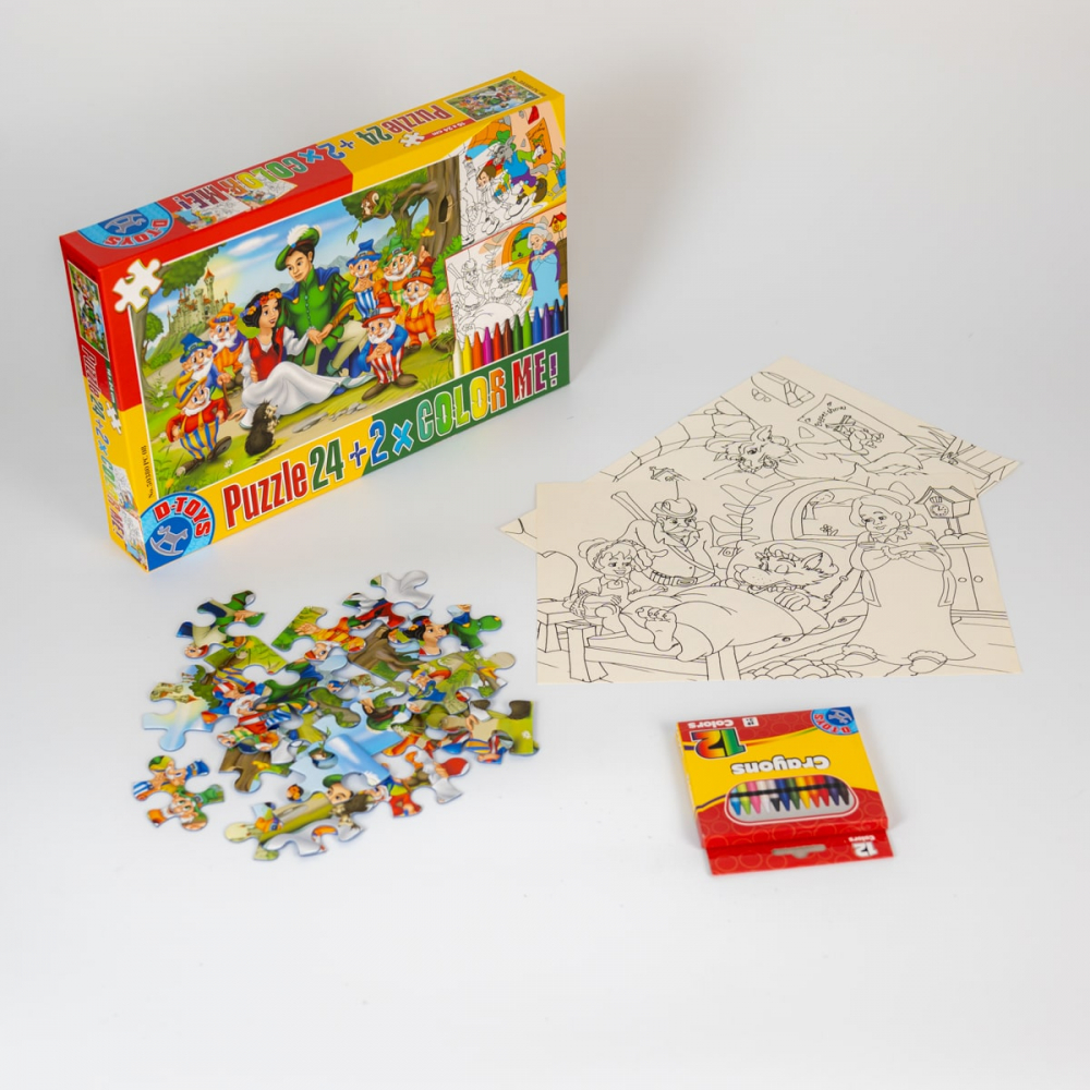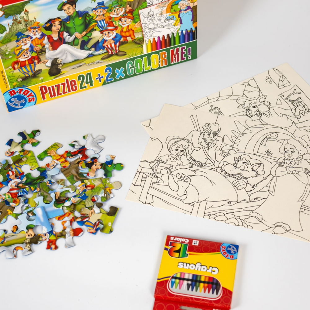 Îți propunem să încerci acest pachet super distractiv, care include un puzzle de 24 piese, cu personajele simpatice din basmul Albă ca Zăpada și două planșe de colorat: Pinocchio și Scufița Roșie, pe care le poți finaliza cu ajutorul setului de creioane colorate cerate (cu 12 culori), inclus în cutie.