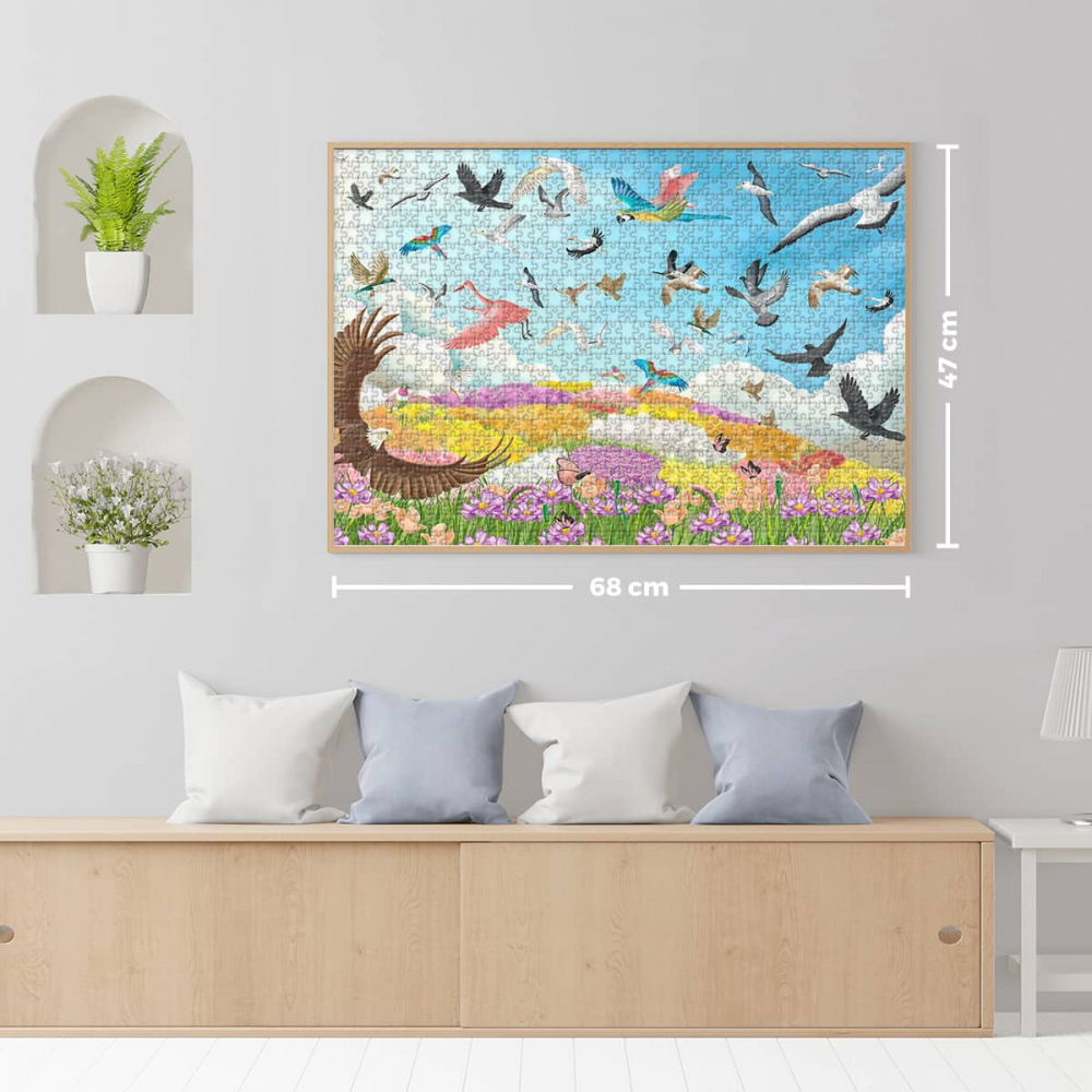 Cu puzzle 1000 piese – Amazing Birds  trăiești senzația de libertate deplină, precum păsările colorate surprinse în zbor spre înaltul cerului.